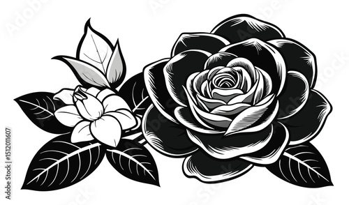 rose, gardenia, flower, floral, design, black, white, monochrome, illustration, graphic, vector, art, botanical, vintage, tattoo, style, drawing, leaf, flower petals, bloom, blossom, nature, elegant, romantic, beauty, classic, stylish, decor, pattern, print, textile, wallpaper, background, card, invitation, wedding, symbol, floral arrangement, floral arrangement