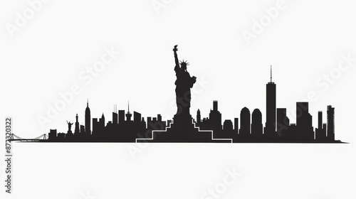 Black and white silhouette art capturing the iconic Statue of Liberty standing in the forefront, with the majestic New York City skyline spanning behind it.