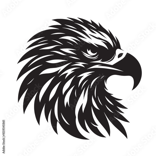eagle, bird, head, black, white, silhouette, wild, predator, fierce, strong, power, nature, animal, wildlife, freedom, vector, graphic, icon, symbol, design, illustration, art, logotype, abstract, sharp, wing, eye, beak, majestic, hunt, hawk, bird of prey, avian, pattern, line, bold, clip art