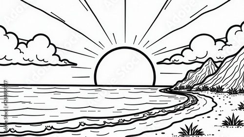 ocean, beach, landscape, line art, illustration, black-and-white, monochrome, drawing, graphic, design element, nature, scenery, sea, wave, shore, sand, mountain, cloud, sun, sunrise, coastal, summer, vacation, travel, holiday, peaceful, serene, calm, tranquil, minimalist, simple, clean, elegant, artistic, creative, hand-drawn, vignetting, outline, vector, printable, clip art, graphic design, digital artwork, artwork, image, picture