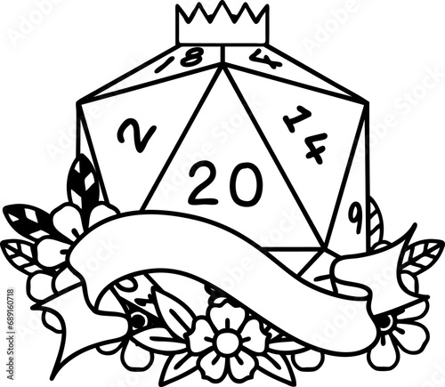 dice, die, natural, 20, 20, critical, hit, luck, lucky, scroll, banner, dragon, game, art, illustration, signs, symbol, drawing, tattoo, retro, style, artwork, icon, black, white, line