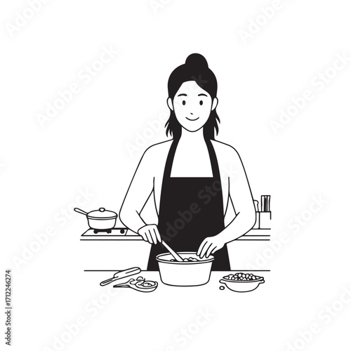 black-and-white, vector, illustration, woman, cooking, kitchen, apron, headband, smiling, pot, stove, line art, minimalistic, simple, clean, drawing, outline, artwork, digital, vignetting, modern, monochrome, domestic, homemaker, culinary, chef, homemaker, cartoon, friendly, warm, atmosphere, lifestyle, cook, female, happy, casual attire, classic, retro, kitchen utensile, utensil, spoon, stirring, minimal, neat, cosy, family