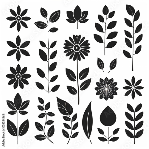 black and white vector illustration of a variety of flower and leaf silhouettes.