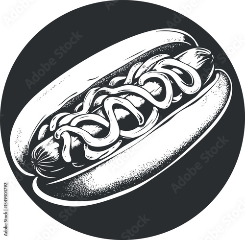 Black and white vintage style illustration of a hotdog in a bun with mustard on top inside a circular frame.
