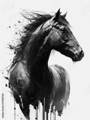 Black and white watercolor illustration of beautiful horse. Generative AI art.