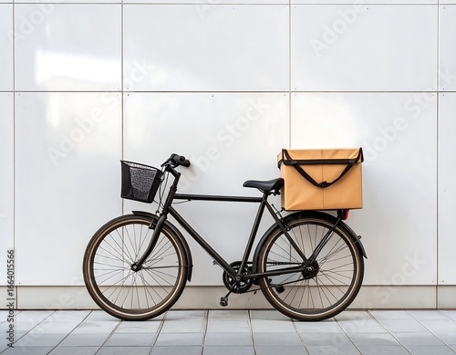 Black bicycle with delivery box parked against a white urban wall, minimal and modern transport concept.