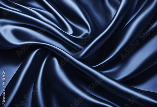 Black blue abstract background. Dark blue silk satin texture background. Beautiful wavy soft folds on the surface of the fabric. Navy blue elegant background with copy space for your design. Web banne