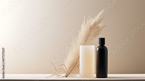 Black Bottle and Candle with Pampas Grass Minimalist Beauty Still Life Product Shot