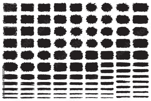Black Brush Stroke and Ink Shape Collection | Grunge Texture, Paint Splatter, and Abstract Design Elements Set, Grunge Speech Bubble Frames Set | Hand Drawn Text Boxes and Brush Rectangle Labels.