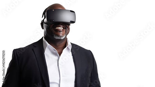 Black businessman smiling portrait, working in VR glasses headset, Concept of digital world and metaverse, isolated on a transparent background