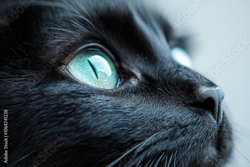 black, cat, green, eye, white, background, studio, detail, portrait, closeup, animal, pet, fur, whisker, gaze, sleek, shiny, expression, texture, cute, adorable, serene, sharpened, high-coloured, beautiful, curious, playfulness, calm, friendly, feature, softness, light, shadow, nature, living, expressive, sharp, vibrant, peaceful, felino, breed, domestic, looking, attentive, head, close, beauty, charme, image
