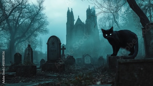 Black Cat in a Foggy Graveyard