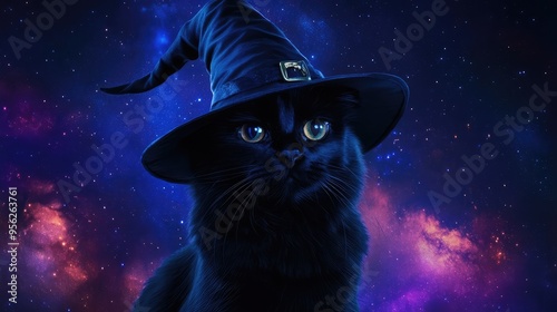 Black Cat in a Witch Hat Halloween Background with Space for Text. AI generated illustration