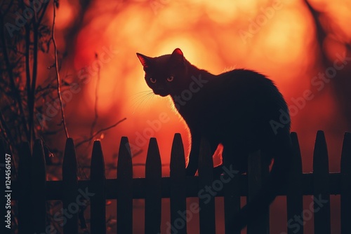 Black cat perched on a fence with a vibrant sunset background during twilight hours