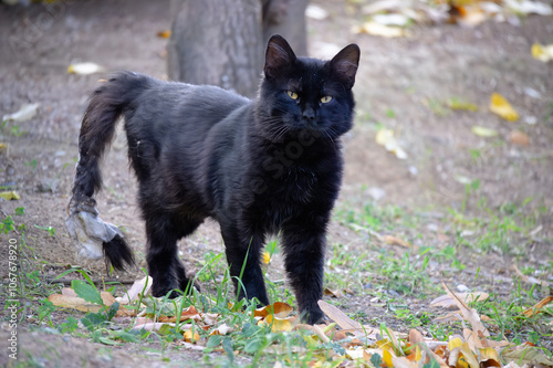 black cat, cat, autumn, leaf, felino, standing, alert, animal, pet, nature, outdoors, park, fall, grass, domestic cat, wildlife, fur, green, earth-tone, natural, curiosity, mammal, whisker, ground, foliage, seasonal, paw, solitary, observing, backyard, relaxed, peaceful, animal portrait, calm