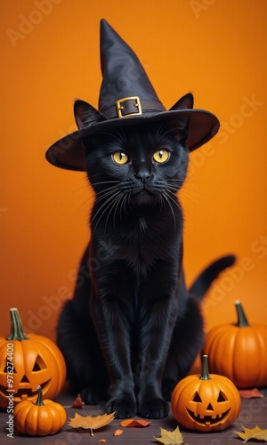 black cat wearing a witch hat, surrounded by jack-o'-lanterns and pumpkins, autumn leaves on the ground, orange background