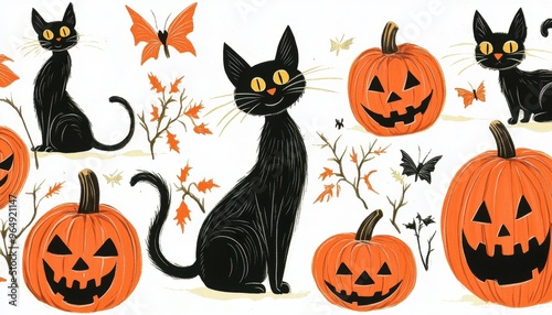Black Cats and Jack-o'-Lanterns with Autumn Leaves and Butterflies