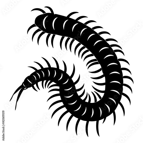 Black centipede illustration on a white background with many legs
