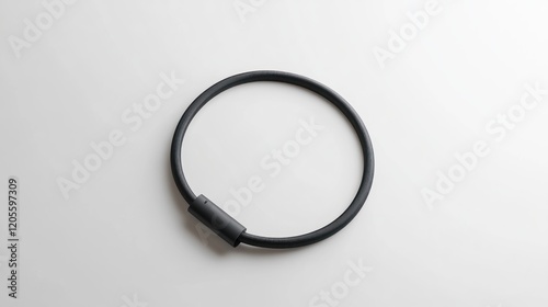 Black circular cable, minimalist, white background, studio shot, tech accessory