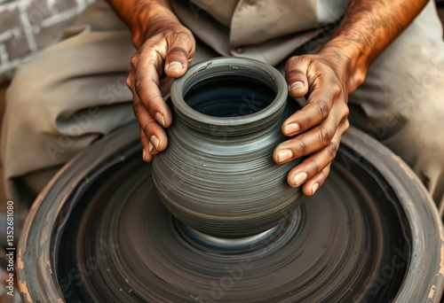 Black clay pot takes shape on spinning wheel, showing artisan's skilled hands shaping the clay, spinning, earthenware