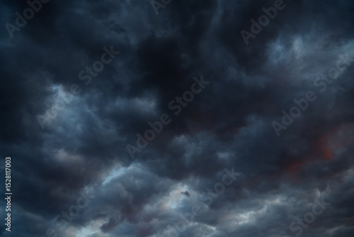 Black clouds with red edges, creeping over a calm sky landscape. Environmental issues, dramatic weather conditions