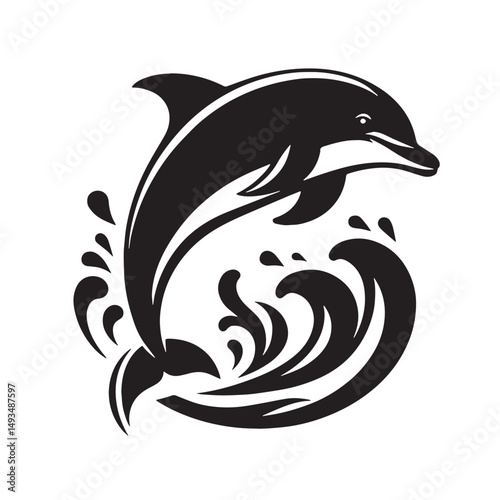 Black Color Dolphin Silhouette Vector Illustration, Solid White Background. minimal vector design
