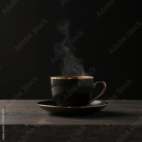 Black cup coffee gold rim saucer, steam rising. Hot beverage drink served on dark wood table with nobody. Modern coffee shop minimalist style background.