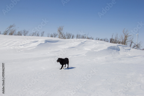 dog, snow, winter, walking, drift, black, animal, pet, canino, cold, sky, blue, deep, bush