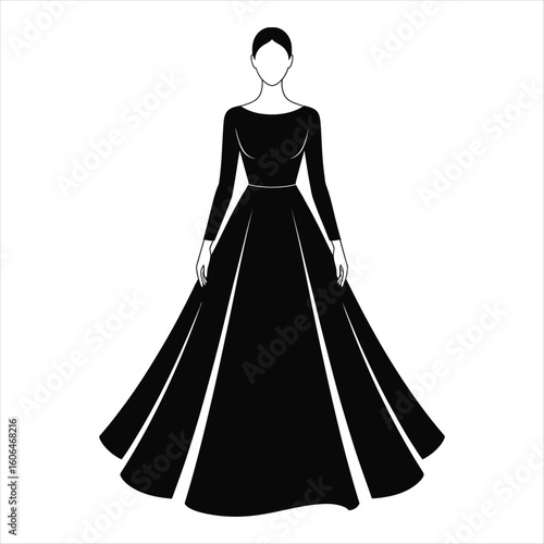 dress, gown, silhouette, black, white, fashion, clothing, elegant, illustration, vector, graphic, design, style, woman, female, evening dress, wedding, bridal, party, minimalist, simple, outline, template, isolated, monochrome