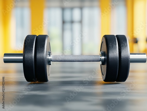 Black Dumbbell on Gray Floor with Yellow Blurred Background