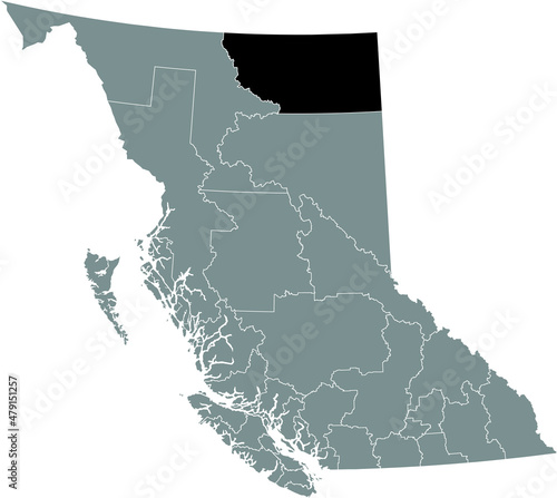 Black flat blank highlighted location map of the NORTHERN ROCKIES regional district inside gray administrative map of the Canadian province of British Columbia, Canada