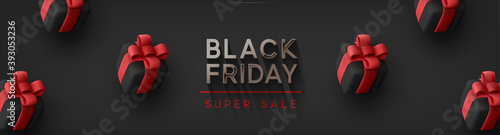 Black Friday Super Sale. Realistic black gifts boxes. Pattern with gift box with red bow. Dark background silver text lettering. Horizontal banner, poster, header website. vector illustration