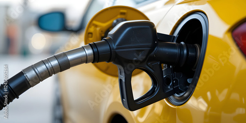 Black Fuel Nozzle in Yellow Car's Fuel Tank with Metallic Tip and Open Fuel Cap
