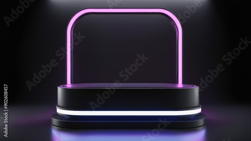 black futuristic carbon podium, horizontal product stand with product presentation space in a futuristic laboratory, neon colours, futuristic carbon podium, ad, podium platform, product presentation