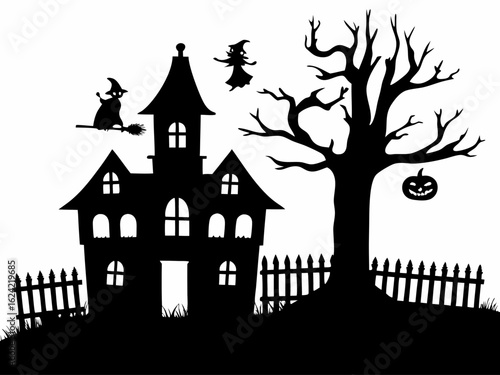 haunted, house, sorcerer, flying, broom, tree, pumpkin, fence, halloween, skittish, scarey, creepy, horror, evil, monster, gothic, dark, mystical, fantasy, holiday, party, trick, treat, october, silhouette, black, graphic, illustration, symbol, icon, clip, art, decor, night, luxury home, forest, magic, vector, castle, town, moon, home, city, cartoon, architecture, building, village, old, sky