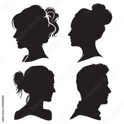 silhouette, head, profile, woman, man, face, portrait, vector, illustration, black, white, isolated, people, person, female, male, adult, young, hair, coiffure, bun, neck, shape, graphic, design, art, style, beauty, beautiful, elegant, simple, minimalist, minimalism, abstract, symbol, icon, signs, avatar, couple, human relationships, family, friendship, diversity, collection, set, group, various, head shot