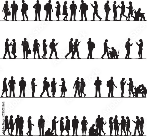 silhouette, people, group, man, woman, walking, standing, sitting, talking, business, casual attire, diverse, crowd, collection, activity, pose, black-and-white, graphic, vector, illustration, modern, simple, abstract, communication, social, urban, lifestyle, movement, interaction, technology, mobile phone, backpack, briefcase