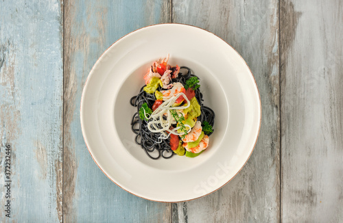 Black Italian seafood pasta with shrimps, cherry tomatoes and greens. Pasta with cuttlefish ink, cooked sea food macaroni.