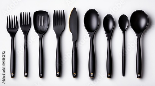 Black Kitchen Utensils Set on White Background Spoons Forks Spatula Knife