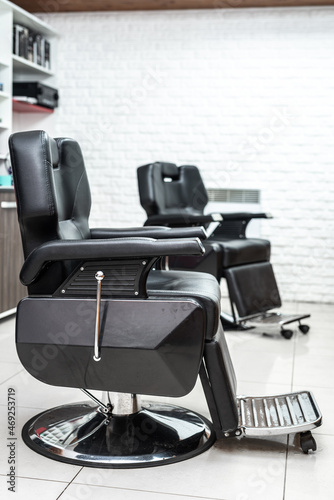 Black leather barbershop used armchair for hairstyles indoors with white wall