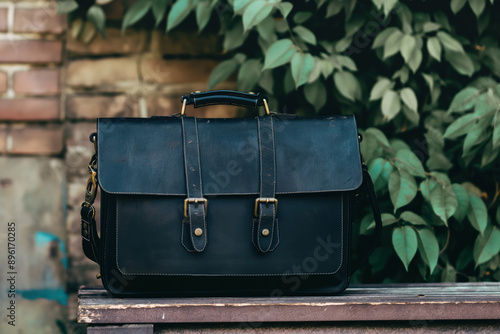 briefcase, leather, black, bag, business, office, work, vintage, style, fashion, accessory, strap, handle, classic, elegant, professional, success, executive, lawyer, businessman, businesswoman, meeting, job, career, finance, document, travel, urban, city, outdoors, bench, wooden, green, foliage, background, nobody