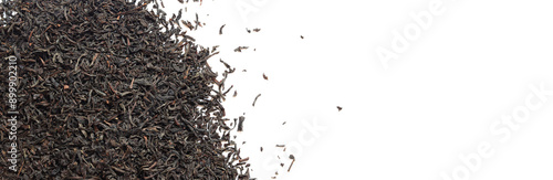 Black long tea on a white background. Top view of dried tea leaves. Tea composition. Ingredients for a hot drink, close-up. Background. Presentation of the type and variety of tea