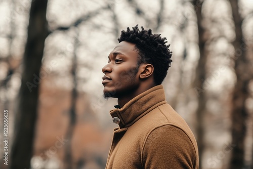 Black man in his 30s wearing a brown coat standing in an autumn park, contemplative expression