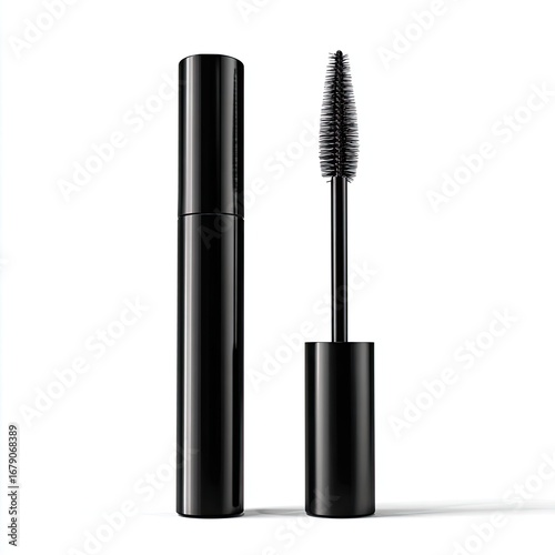 mascara, black, tube, wand, cosmetic, make-up, beauty, product, cardboard box, illustration, graphic, design, cylindrical, round, glossy, shiny, isolated, white, background, closeup, realistic, three-dimensional, cosmetic, bottle, container, accessory, eyelash, care, elegant, modern, simple, styling