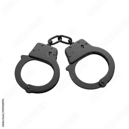Black matte handcuffs with curved connecting chain lying flat isolated on pure white background in realistic security and law concept