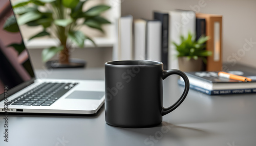 Black matte mug placed on a sleek office desk with a laptop, modern business workspace mockup, clean lighting