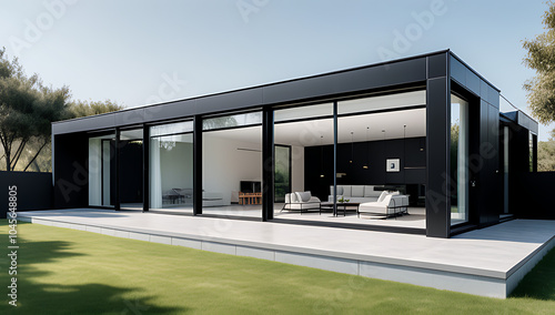 black metal glass walls surround modern modular residential villa sleek architectural design
