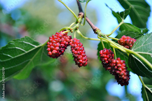 Black mulberry or blackberry red unripe berries on twig, blurry soft background