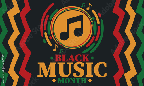Black Music Month in June. African-American Music Appreciation Month. Celebrated annual in United States. Music concept. Poster, card, banner and background. Vector illustration