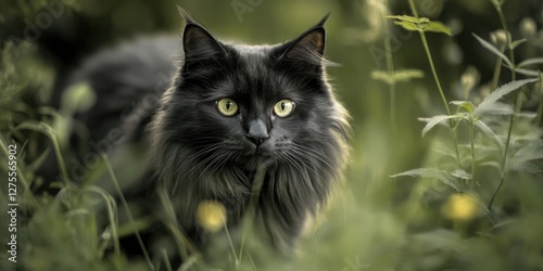 cat, norwegian, black, forest, alert, expression, stalk, grass, lush, flower, gold, captivating, behaviour, nature, animal, pet, wildlife, domestic, grace, elegance, hunting, stalking, outdoors, vibrant, green, flora, beauty, cute, furry, whisker, eye, fur, garden, summer, playfulness, playful, predator, scene, peaceful, calmness, environment, habitat, paw, attentive, felino, character, stalk, meadow